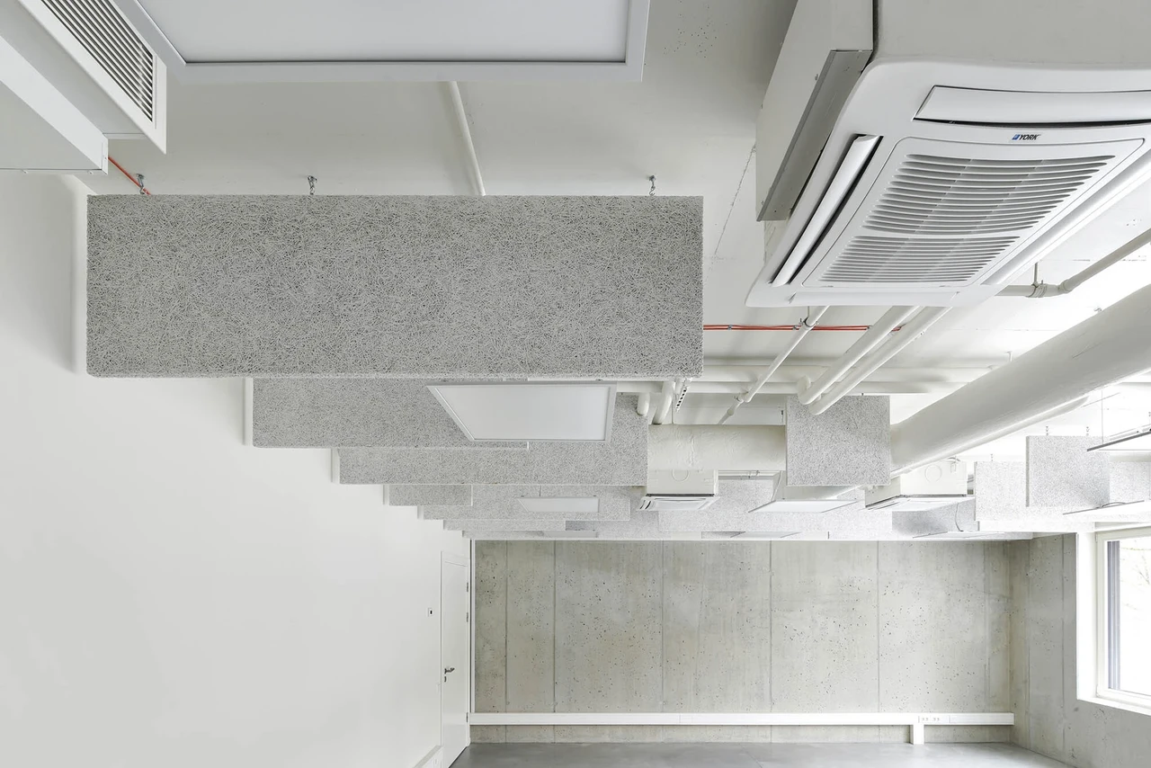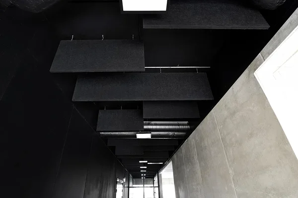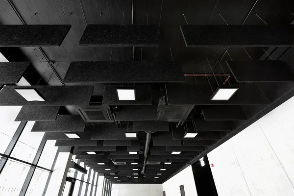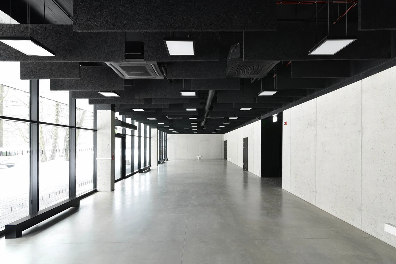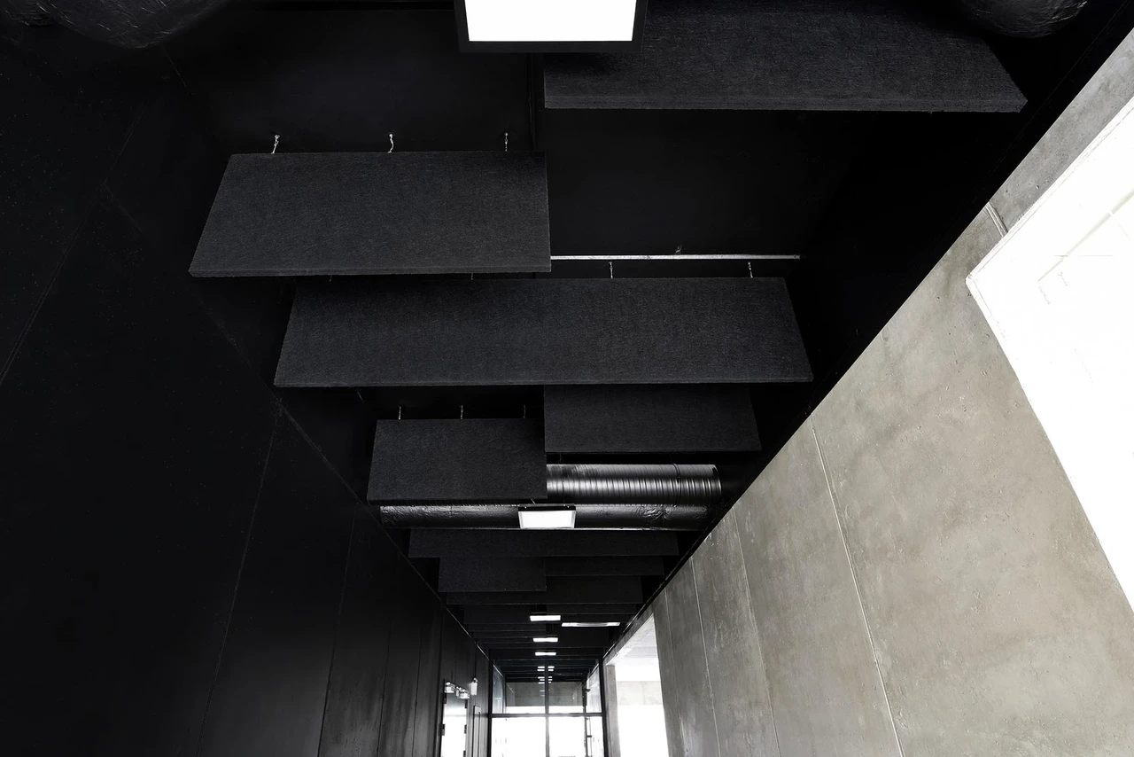 Sisekujundus järgib must-valget (monokroomset) esteetikat; valgete ja mustade CEWOODi Baffle’i paneelidega lagi on nii visuaalne keskpunkt kui ka osa akustilisest lahendusest.