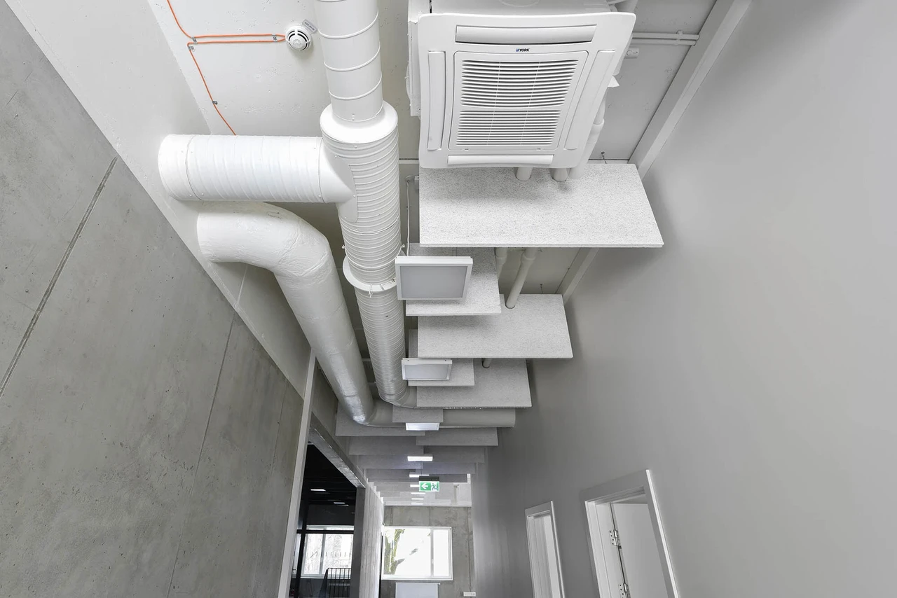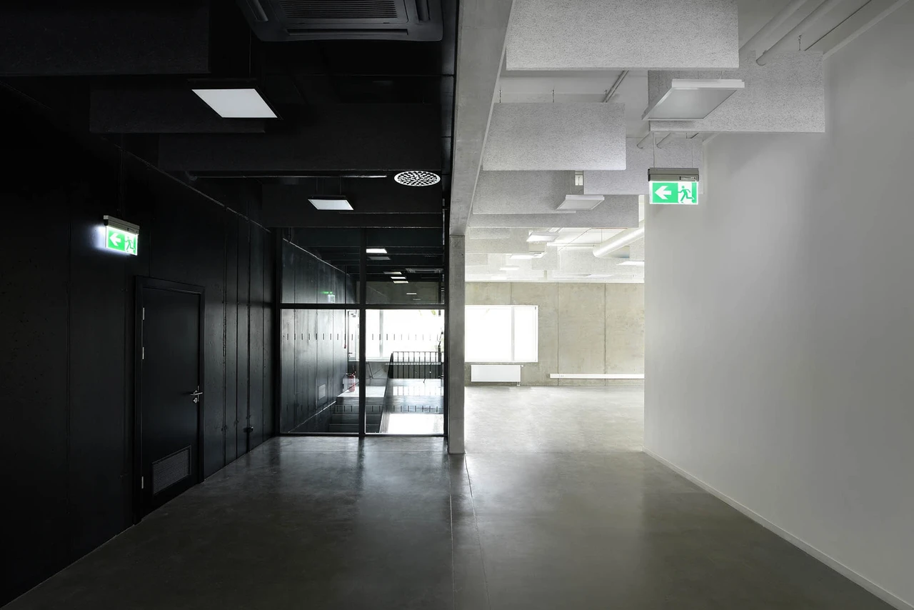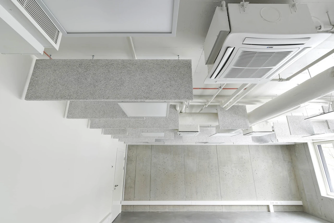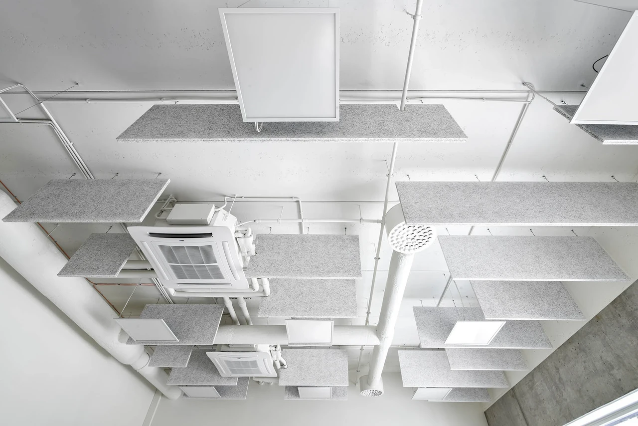 Sisekujundus järgib must-valget (monokroomset) esteetikat; valgete ja mustade CEWOODi Baffle’i paneelidega lagi on nii visuaalne keskpunkt kui ka osa akustilisest lahendusest.