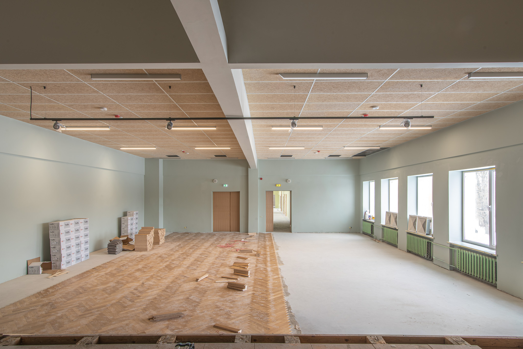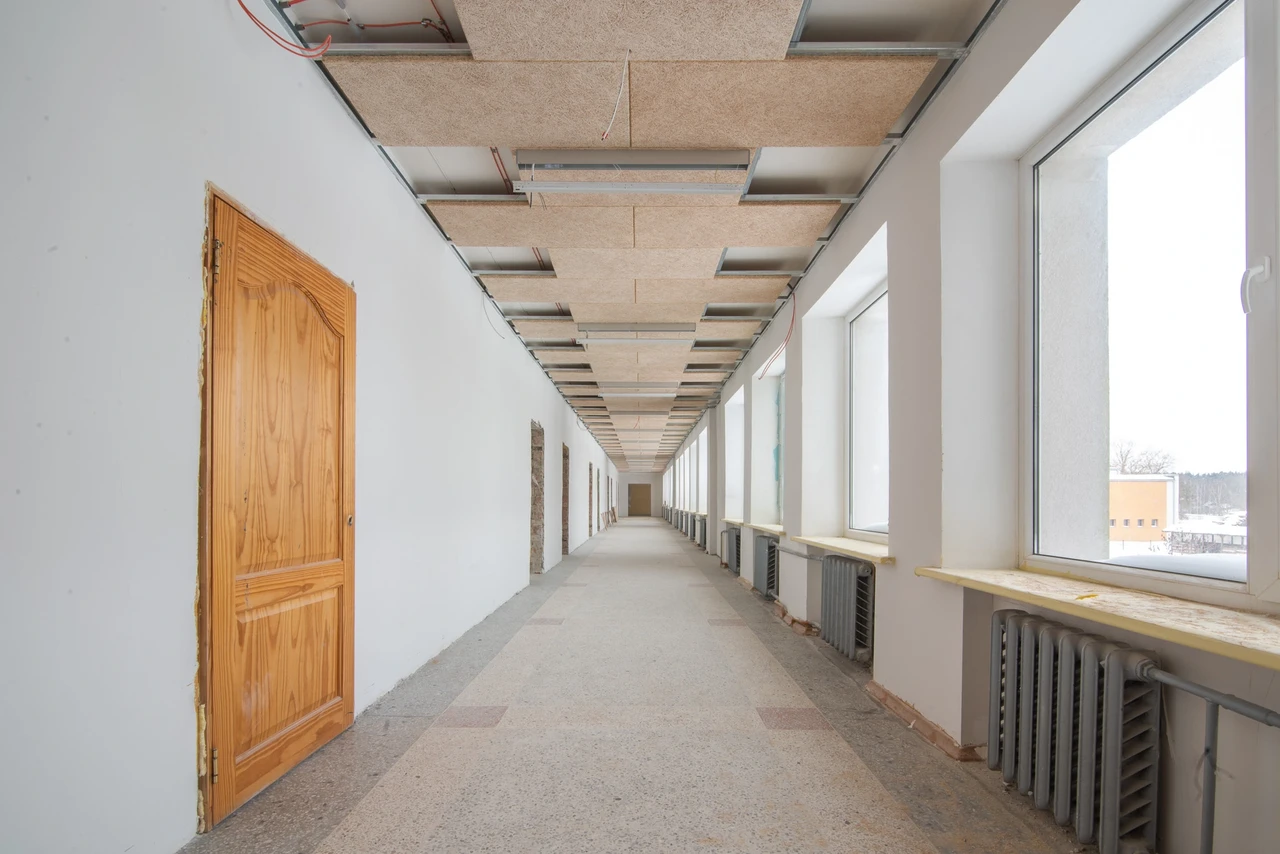 Līdzīga pieredze ir arī Suntažu pamatskolā, kur telpu atjaunošana tuvojas noslēgumam. Projekta autori, birojs “Baltex GROUP”, kā vienu no centrālajiem elementiem izvēlējušies Latvijā visplašāk iecienītāko risinājumu – balti krāsotas CEWOOD Plātnes. Tās uzstādītas uz CD profilu konstrukcijas, nodrošinot telpām nepieciešamo akustisko mieru. Skolu gaiteņos un klasēs, kur valda liela trokšņu slodze, materiāla porainā struktūra efektīvi absorbē skaņu un novērš atbalsi. To ģipškartons nespēj nodrošināt bez papildu risinājumiem.